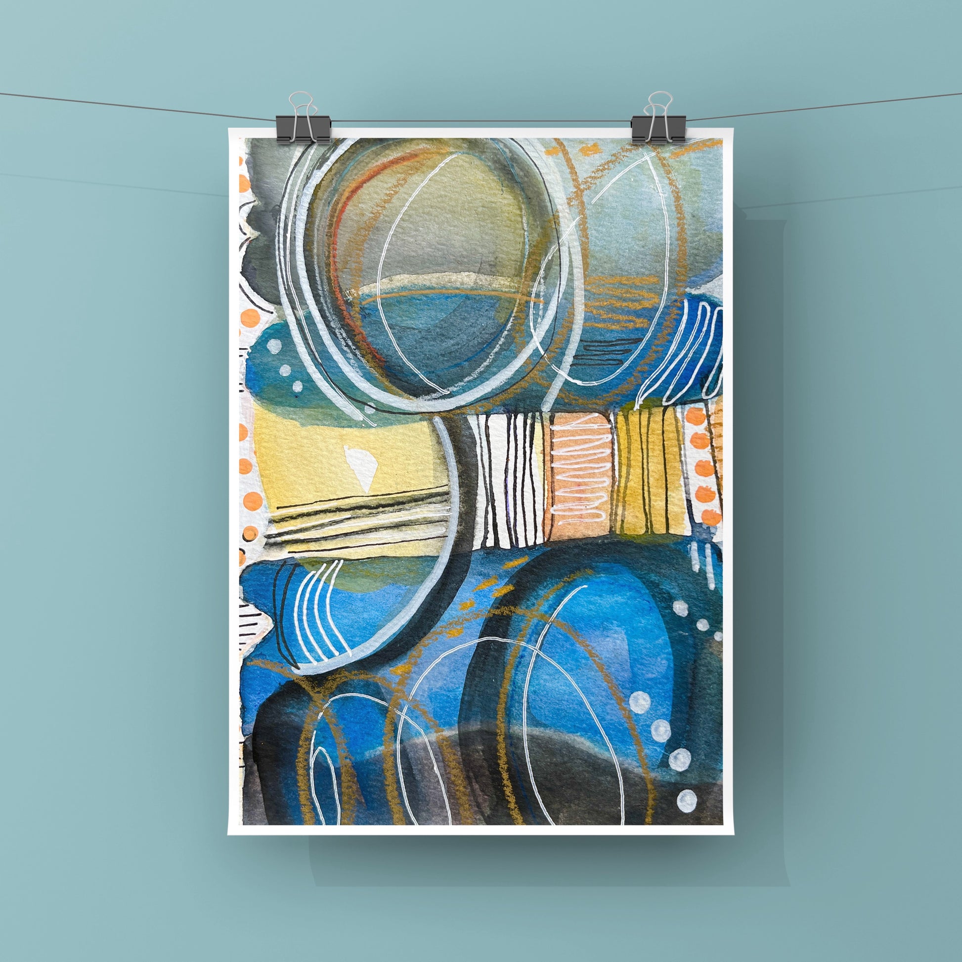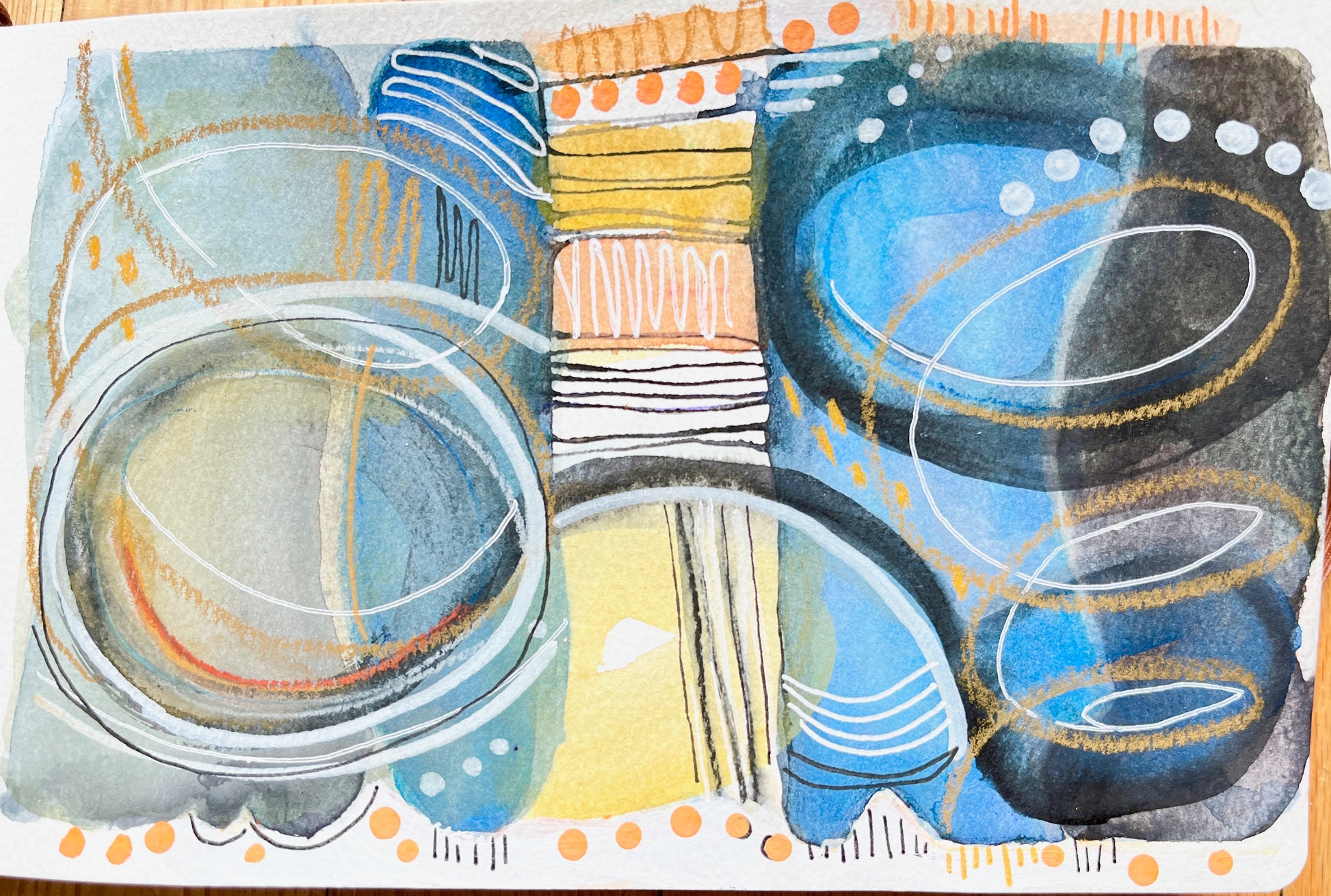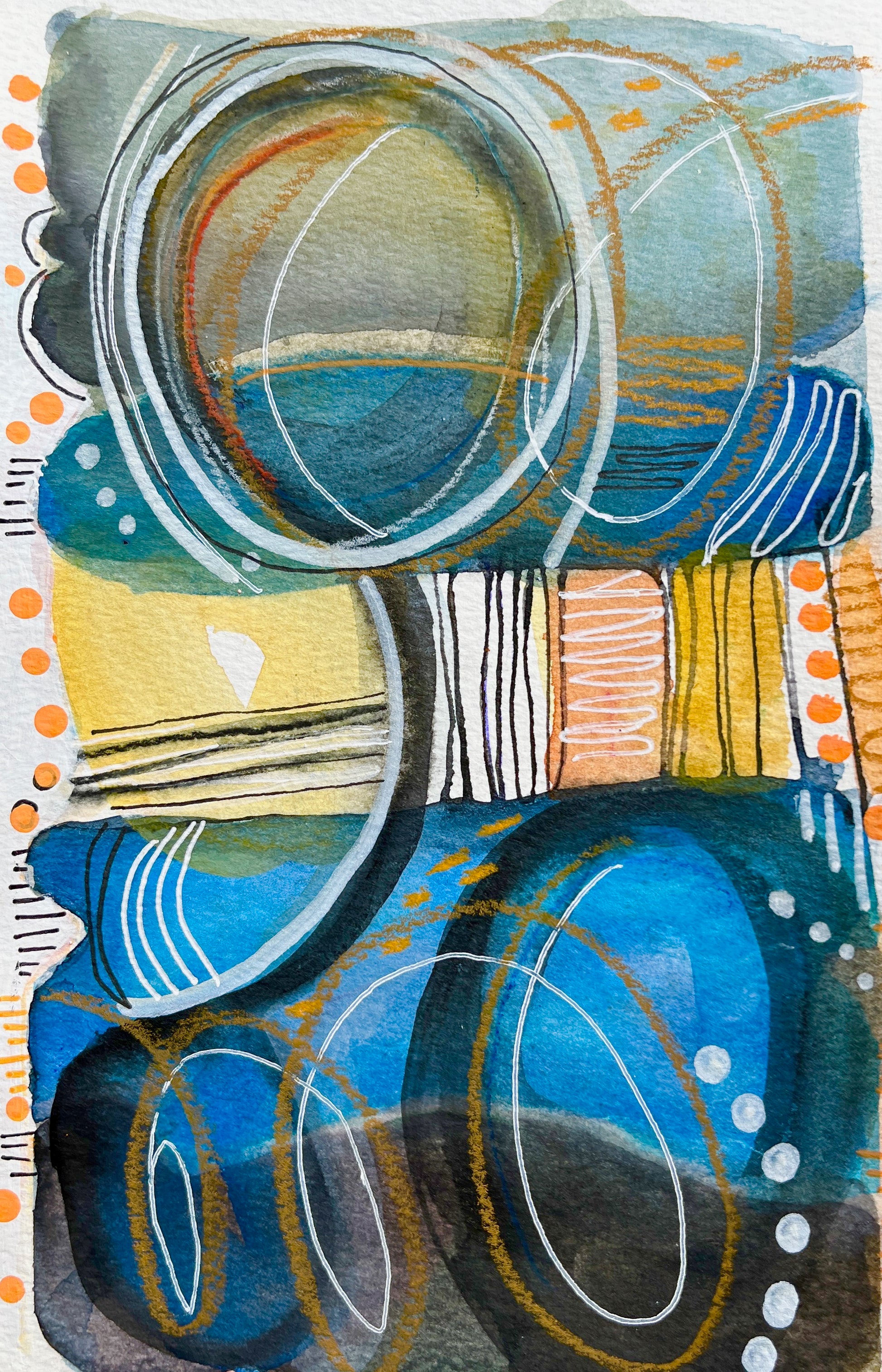 Colorful mixed media watercolor and ink on 5x7 paper filled with patterns and lines.