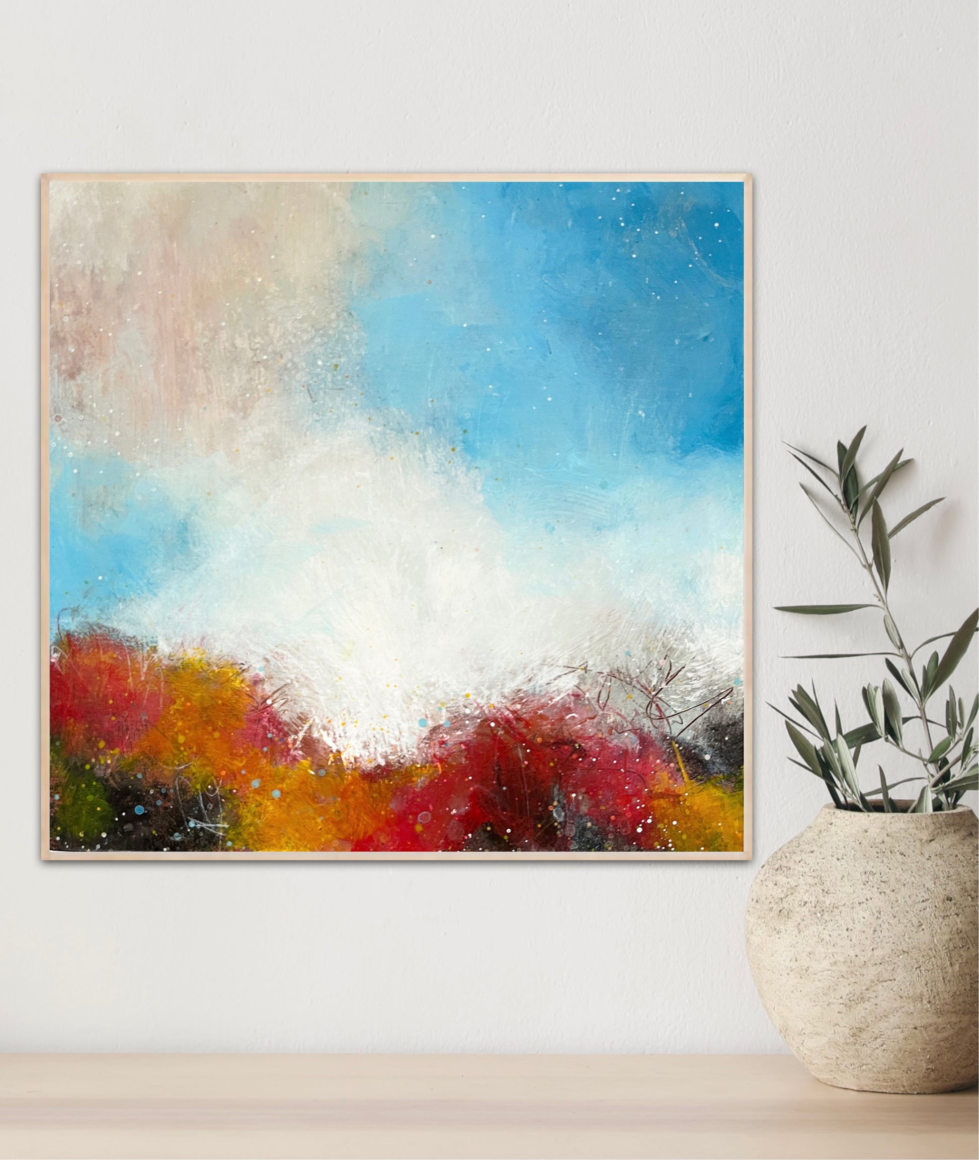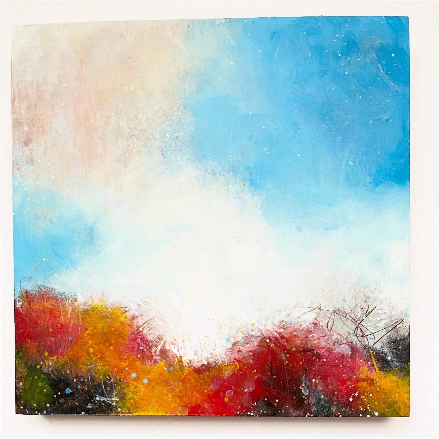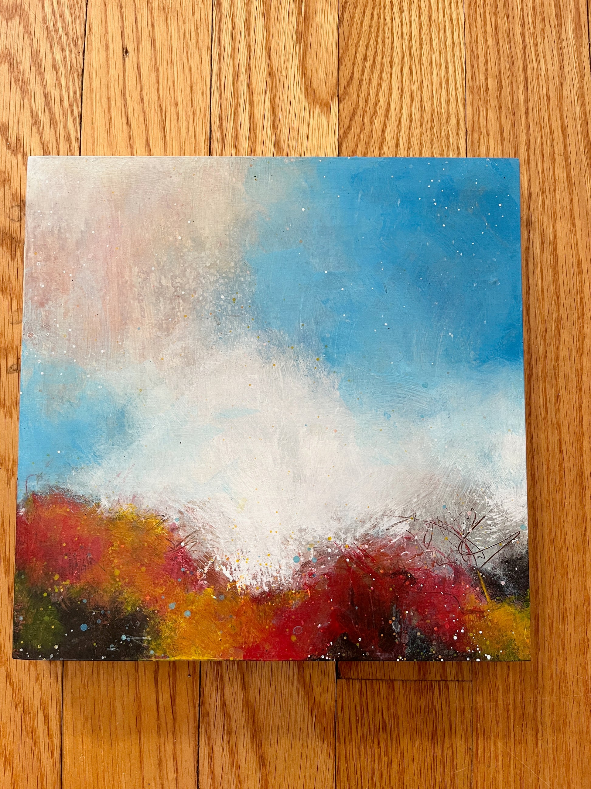 Colorful contemporary landscape on wood panel, filled with soft and subtle colors and layers. This piece with painted sides can be hung as is or framed.
