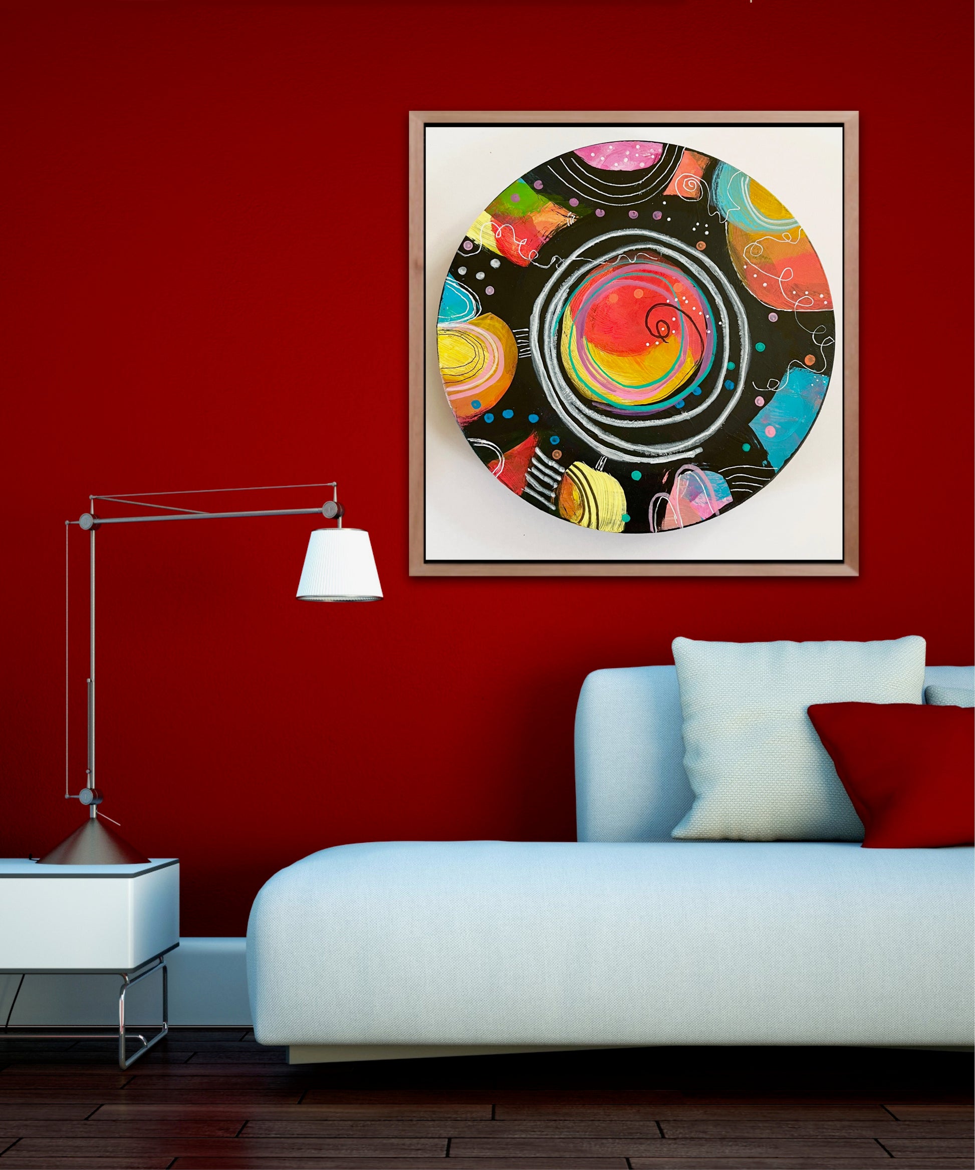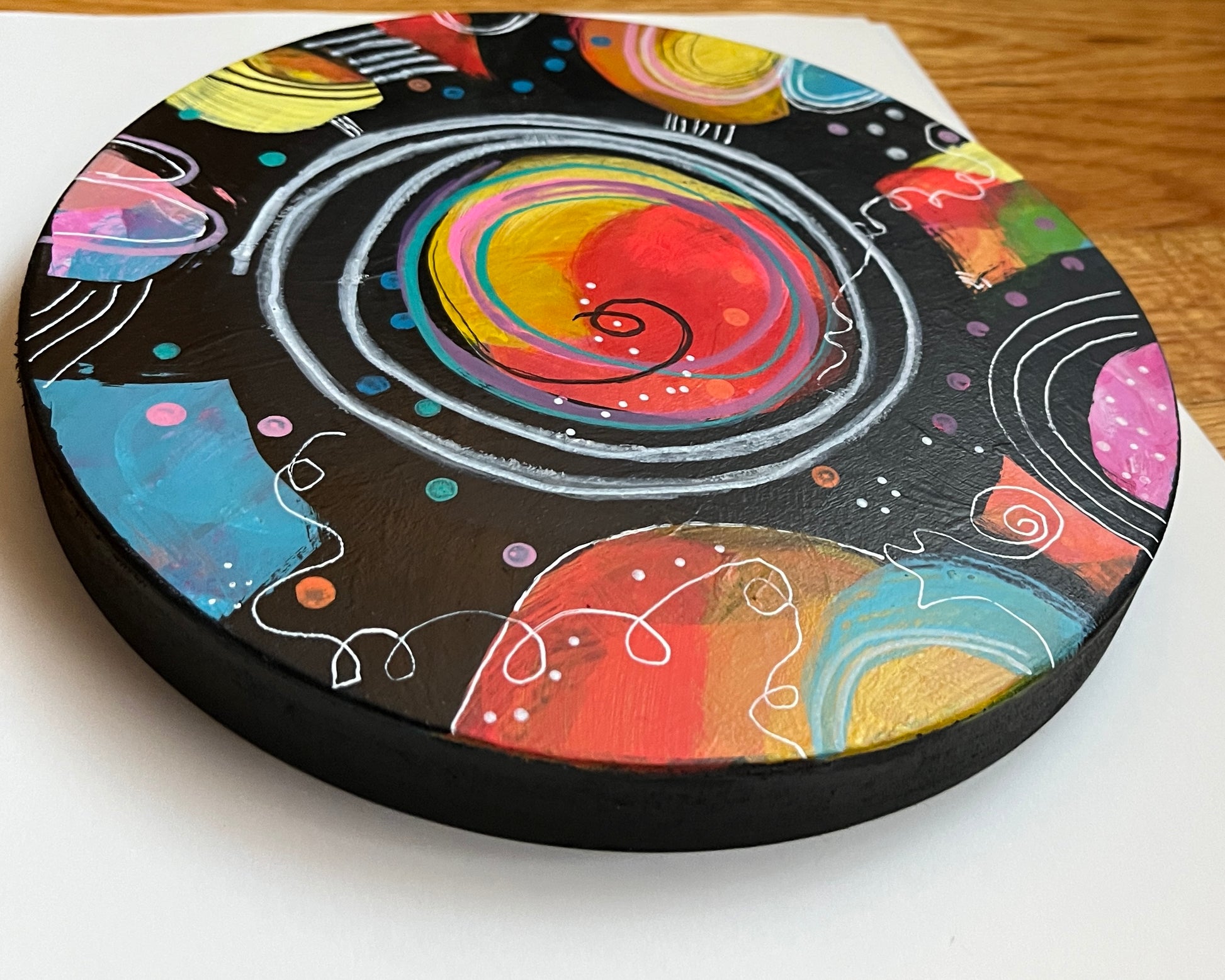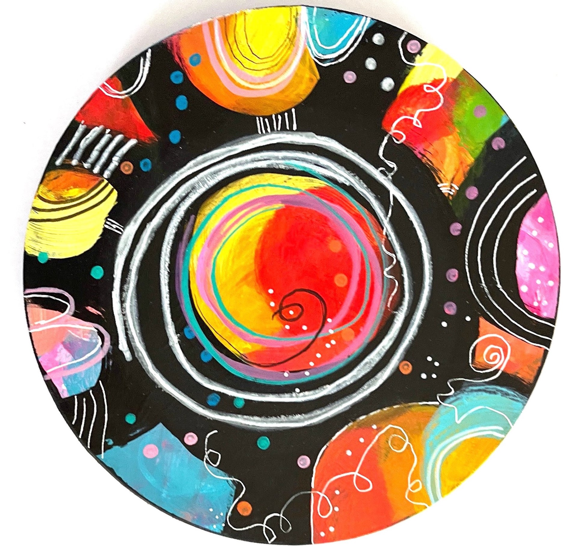A colorful mixed media 8" round painting on wood. This bright and colorful painting has sides painted black and can be hung unframed. It will bring a pop of color to any space.